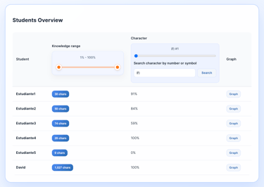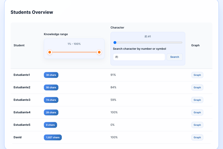See the full picture: what characters they know, which ones they struggle with, which ones they need to review more often, and how their skills evolve over time.